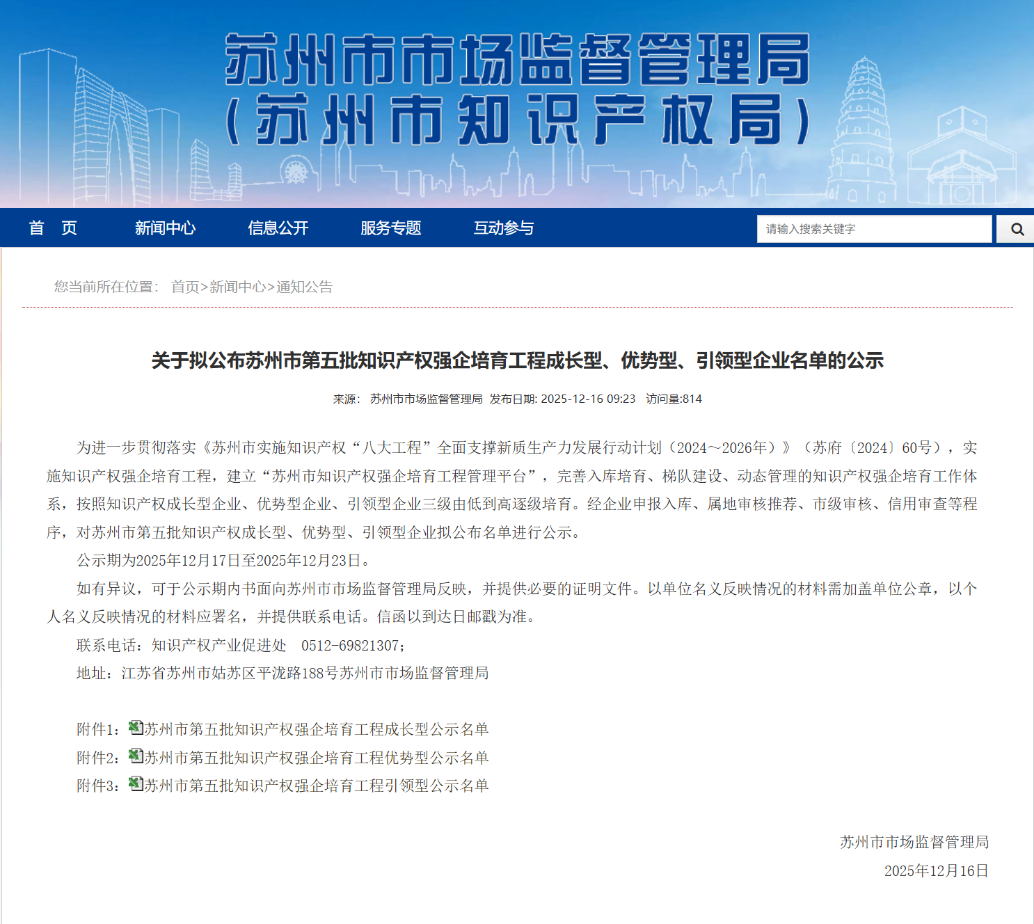 日前,苏州市市场监督管理局发布了第五批知识产权强企培育工程名单的公示。公海710凭借在知识产权领域的扎实工作,成功入选知识产权强企培育工程“成长型企业”名单。这标志着710公海AiTEN在科技创新与知识产权体系管理上获得了市场的认可。